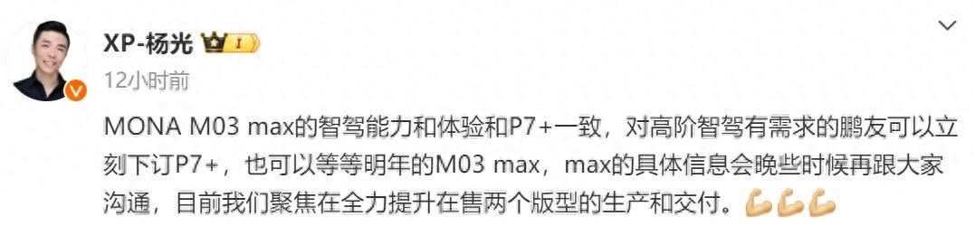 隨后,小鵬MONA產(chǎn)品負(fù)責(zé)人楊光透露,即將于明年推出的MONA M03 Max車型在智能駕駛能力、體驗(yàn)方面將與P7+保持一致。楊光表示,對(duì)于追求高階智能駕駛體驗(yàn)的用戶來說,M03 Max值得等待。關(guān)于Max車型的更多具體信息將在晚些時(shí)候公布,目前小鵬汽車正聚焦于提升在售車型的生產(chǎn)和交付效率。